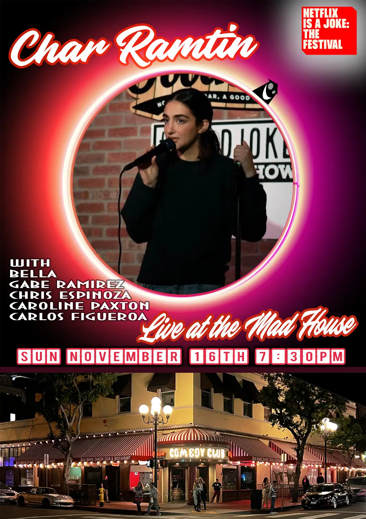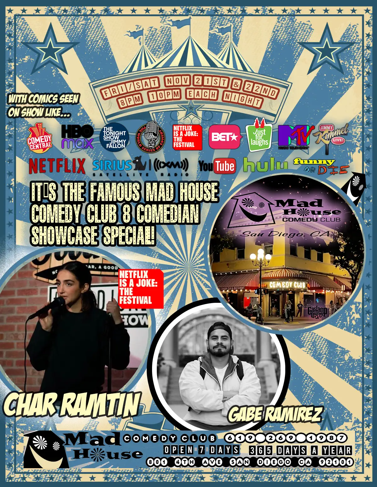 It’s The World Famous Mad House Comedy Club’s Showcase Special! With two headliners this week! Gabe Ramirez and Char Ramtin from Netflix! Plus another 6 stand up comedians all on one show!