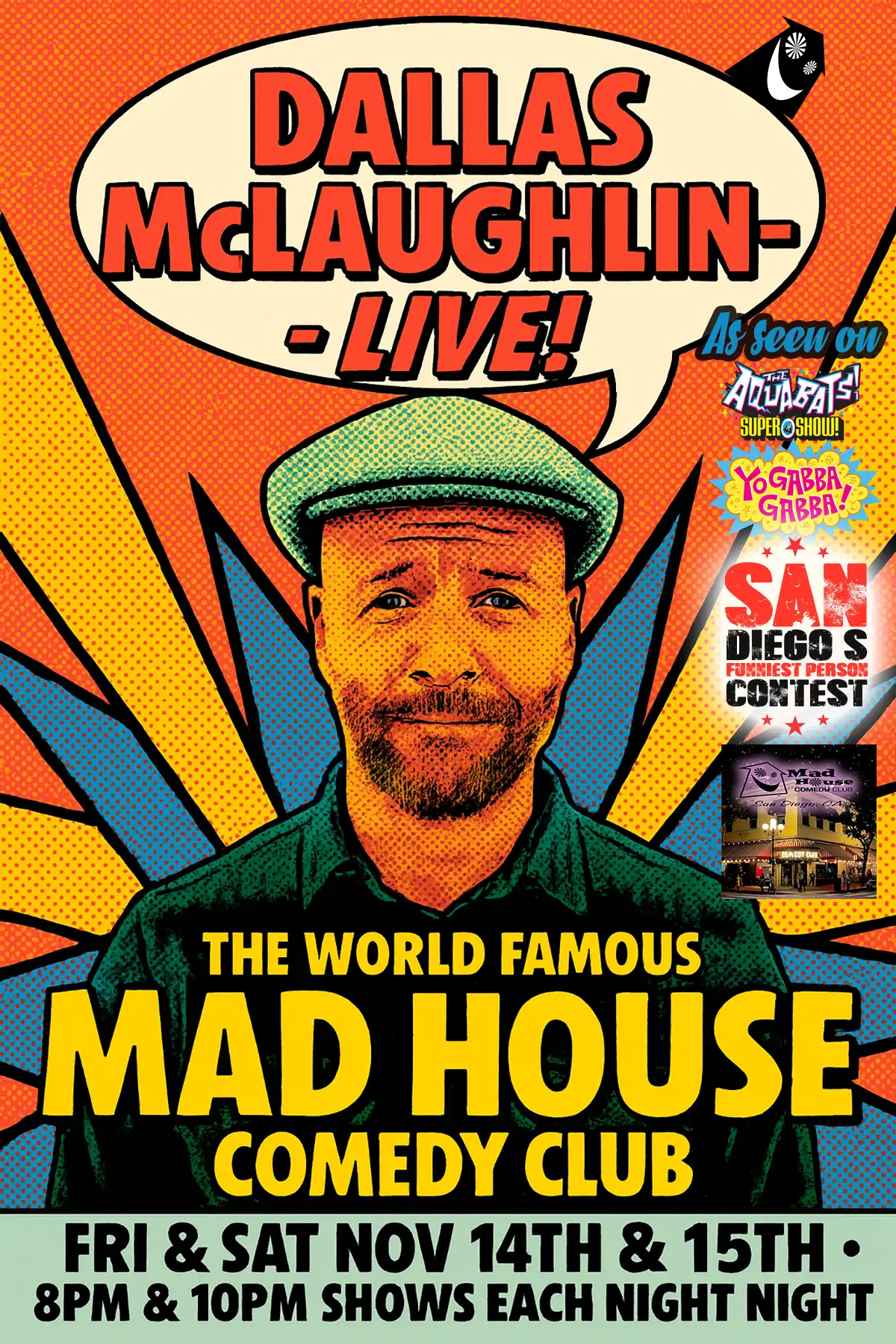 It’s The World Famous Mad House Comedy Club’s Showcase Special starring Emmy winner Dallas McLaughlin as seen on Yo Gabba Gabba, The Aquabats Super Show and Champ of The San Diego’s Funniest Person Contest! Plus another 6 stand up comedians all on one show!