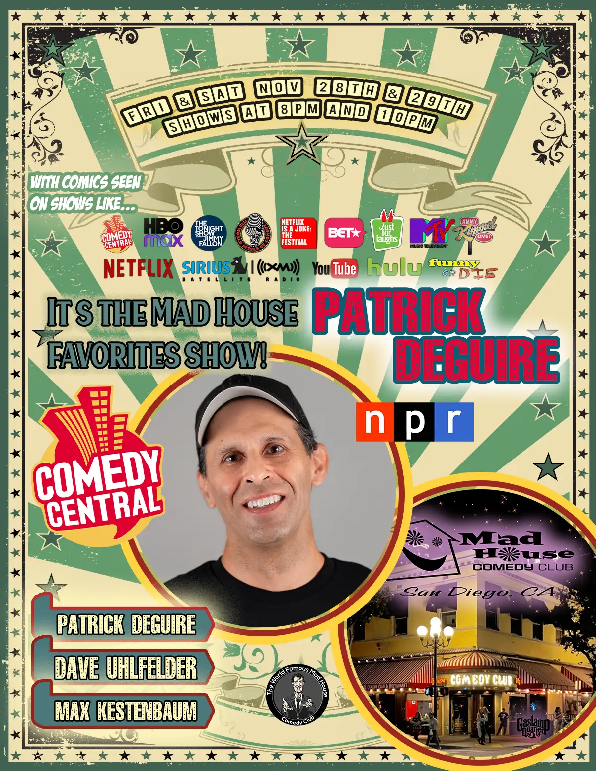 It’s The World Famous Mad House Comedy Club’s Showcase Special! Starring Patrick DeGuire as seen on Comedy Central, NPR, The Bob and Tom Show, USO, NPR and more! Plus another 6 stand up comedians all on one show!