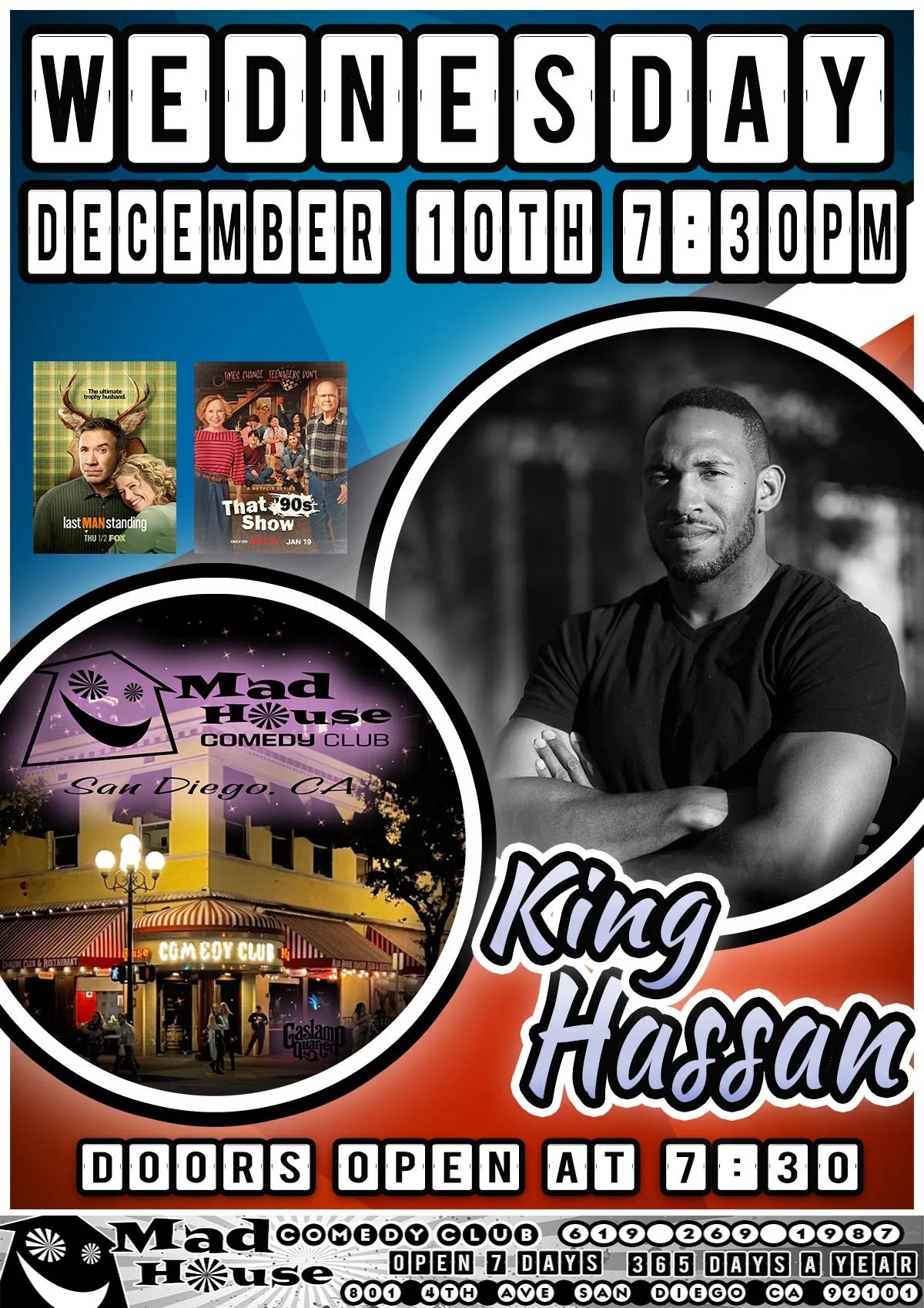 It’s The Mad House Comedy Club Favorites Show starring King Hassan as seen on That 90’s Show, Last Man Standing and more! Plus another 7 awesome stand up comics all on one show!