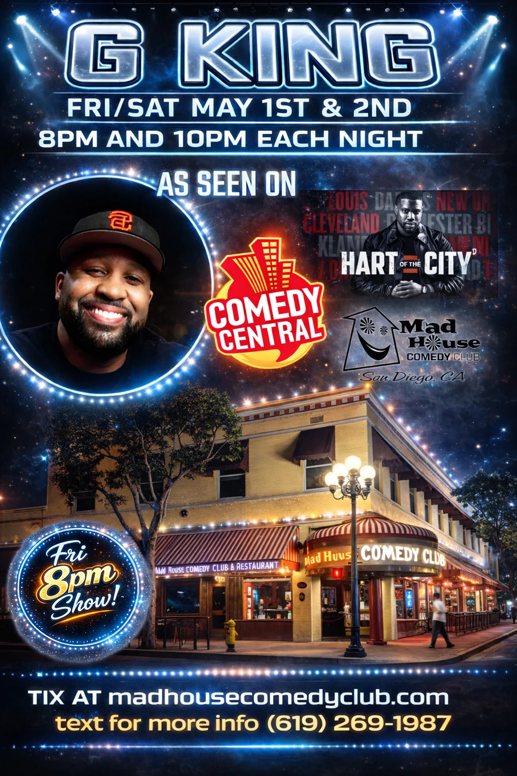 Its The World Famous Mad House Comedy Club’s 8 Comedian Showcase Special starring G King as seen on Kevin Hart’s hit show Hart of The City on Comedy Central’s and more! Plus another 7 amazing stand up comics all on one show!
