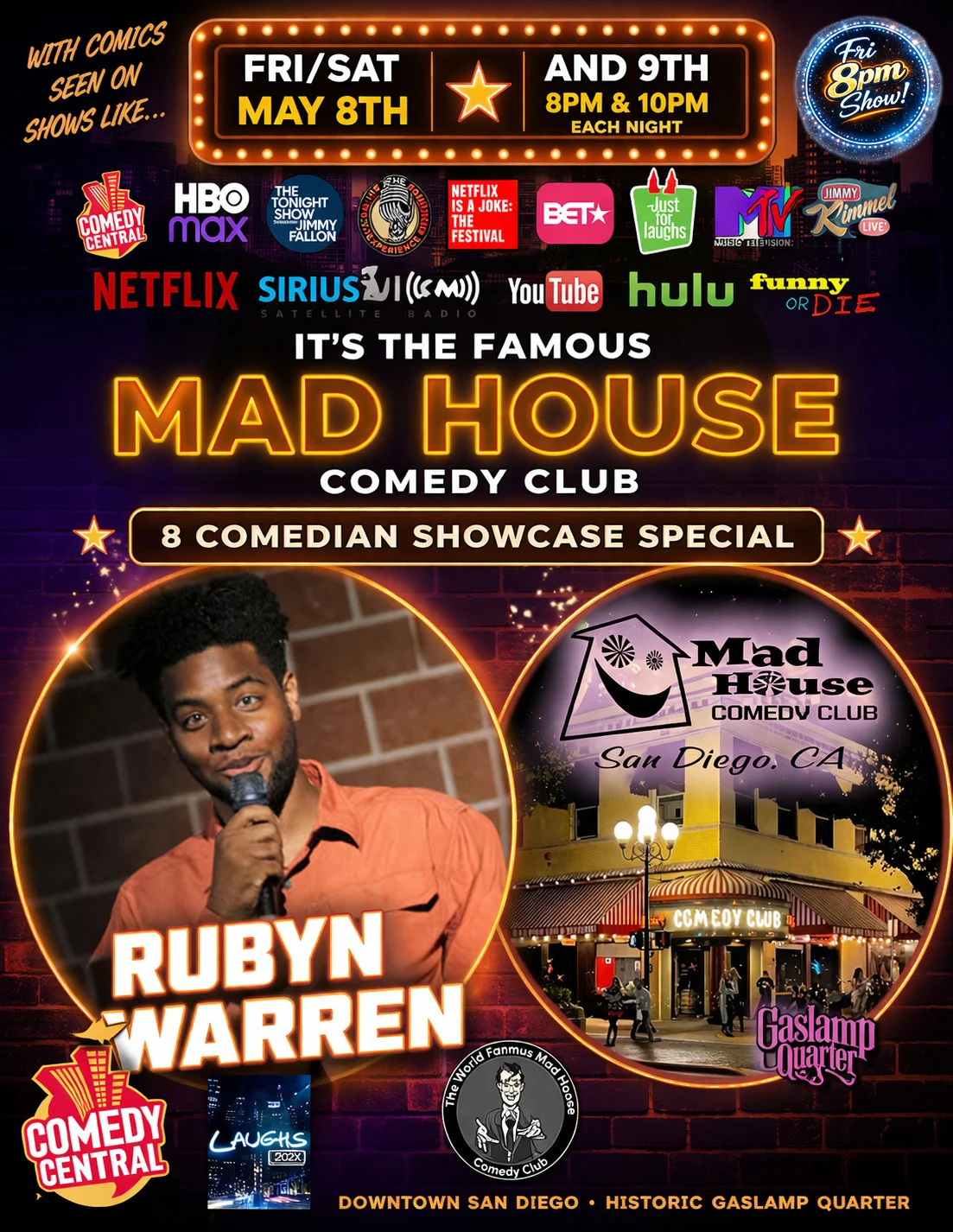 Its The World Famous Mad House Comedy Club’s 8 Comedian Showcase Special starring Rubyn Warren as seen on Netflix, Comedy Central, BET, Laff Mobbs Laff Tracks, Laughs on Fox and more! Plus another 7 amazing stand up comics all on one show!