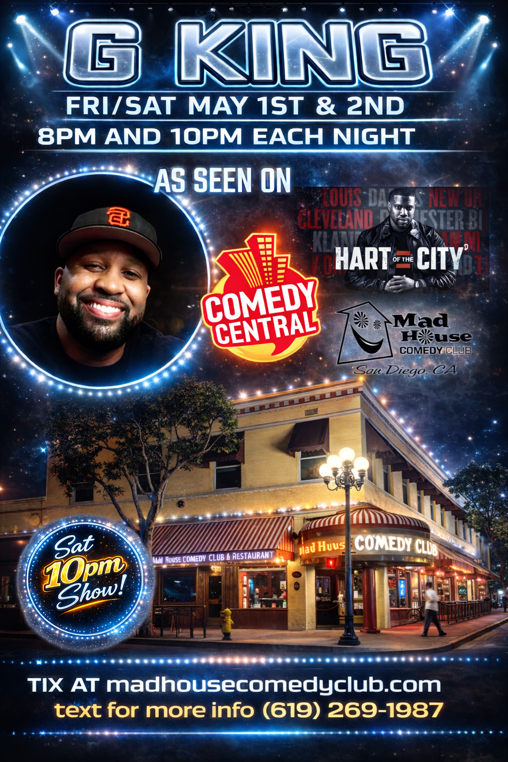 Its The World Famous Mad House Comedy Club’s 8 Comedian Showcase Special starring G King as seen on Kevin Hart’s hit show Hart of The City on Comedy Central’s and more! Plus another 7 amazing stand up comics all on one show!