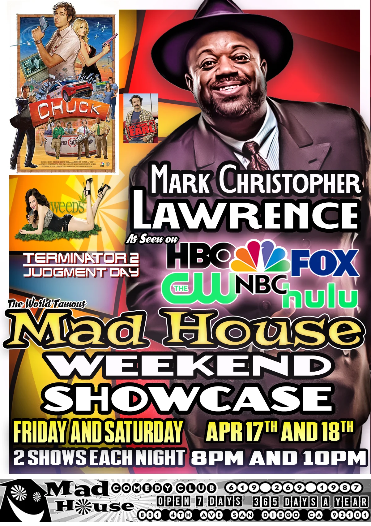 By robert|2026-03-18T19:40:35-07:00March 18, 2026|Comments Off on Its The World Famous Mad House Comedy Club’s 8 Comedian Showcase Special starring Mark Christopher Lawrence as seen on NBC’s Chuck, Weeds, Terminator 2, My Name is Earl, Seinfeld and more! Plus another 7 amazing stand up comics all on one show!